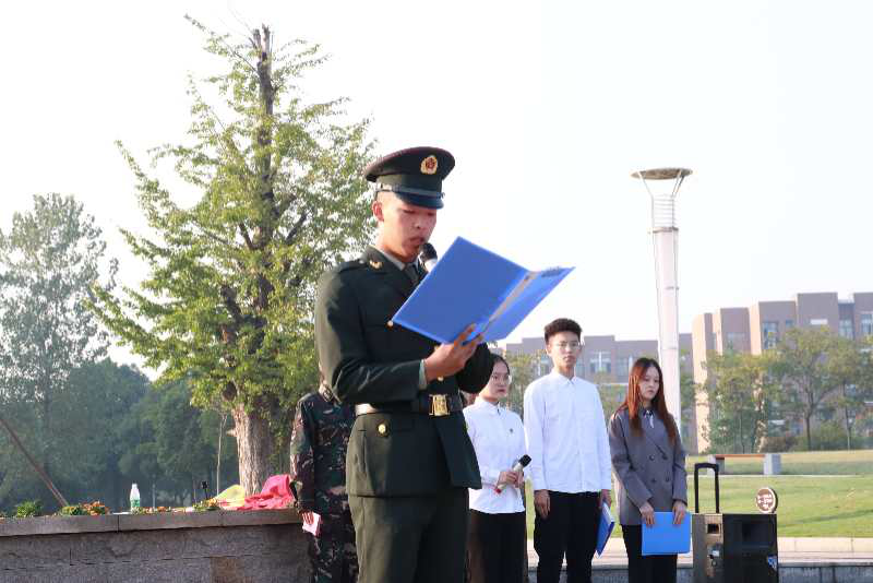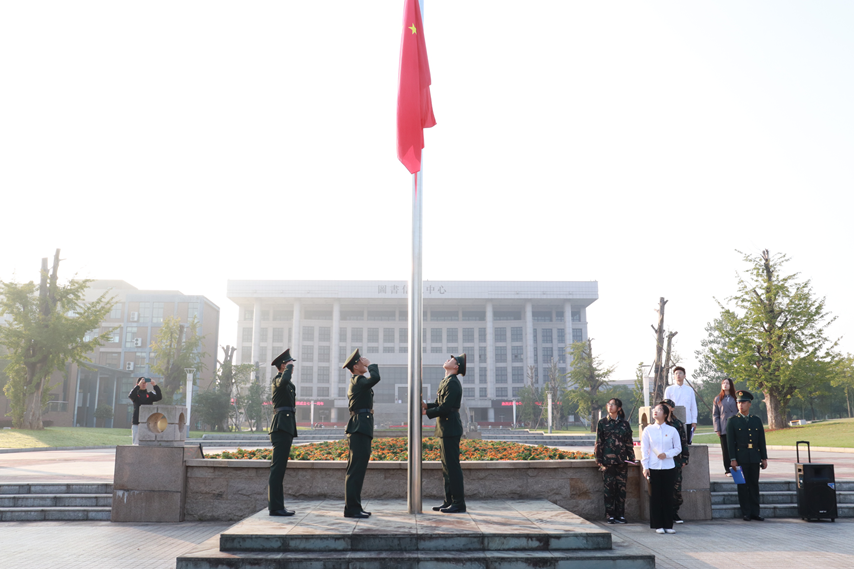 早上7点,学院青年先锋排的旗手擎着五星红旗,伴随着响亮的口号,列着整齐的方阵,迈着统一的步伐走向升旗台。在场师生庄严肃立,注视着国旗缓缓升起,并高声奏唱中华人民共和国国歌。