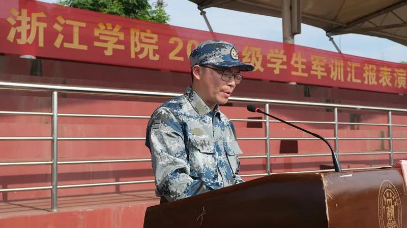 孔德民代表学院向金东区人武部领导、全体教官表示由衷感谢,向以优异成绩通过军训这门必修课的全体2020级学生表示热烈祝贺。孔德民表示,学生们在军训期间不仅以教官为榜样,坚韧不拔、刻苦训练,同时在雨天时能自律自觉参与观看庆祝中国共产党成立100周年大会直播等活动,用自己的形式向中国共产党成立100周年献礼。最后,孔德民向全体2020级学生提出三点希望:一是希望同学们心怀梦想、志存高远,做有理想和有信念的有志青年;二是希望同学们不负韶华、创新不止,做有能力和有学识的追梦青年;三是希望同学们坚韧不拔、砥砺前行,做有责任和有担当的实干青年。