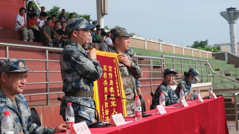 金东区人武部军事科科长徐奇宣读了军训“优秀方阵”和“先进个人”嘉奖令,主席台上领导们为获奖方阵颁发锦旗。