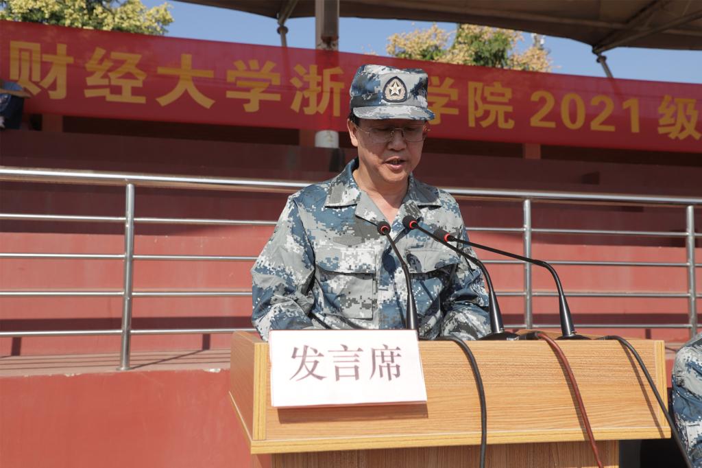 学院党委副书记孔德民做总结讲话。孔德民代表学院向金东区人武部领导、全体教官表示由衷感谢,向在军训中涌现出的先进集体和先进个人表示热烈的祝贺。孔德民表示,军训时间虽然短暂,但同学们以教官为榜样,坚韧不拔、刻苦训练,学习军人严肃认真的态度、吃苦耐劳的精神和勇于挑战自我的斗志,为大学生活交出了第一份满意的答卷。最后,孔德民向全体2021级新生提出三点希望:一是希望同学们坚定理想信念,做一名心怀祖国、志存高远的财浙青年。二是希望同学们练就过硬本领,做一名仰望星空、脚踏实地的财浙青年。用青春坚守初心,用奋斗书写担当,在大学四年里,开阔眼界,不断拓展学习视野;学会思考,常思短处与不足;勇于实践,努力提高动手操作和实践能力。三是希望同学们锤炼高尚品格,做一名厚德博学、经济匡时的财浙青年。谨记“修业必先修德”,自觉弘扬爱国主义、集体主义、社会主义思想,积极倡导社会公德、职业道德、家庭美德和个人品德,带头倡导良好社会风气,以自己的实际行动促进社会道德进步,真正成为德智体美劳全面发展的社会主义建设者和接班人。