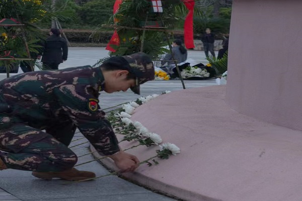 在祭奠环节,先锋排成员们手持鲜花,摘下帽子默哀三分钟,向先烈们深深鞠躬致敬,将手中的鲜花献给长眠于此的革命烈士,绕革命烈士纪念碑一圈,以表达对为革命事业而牺牲的先烈的哀思。