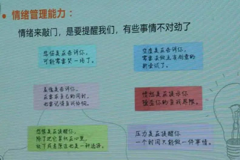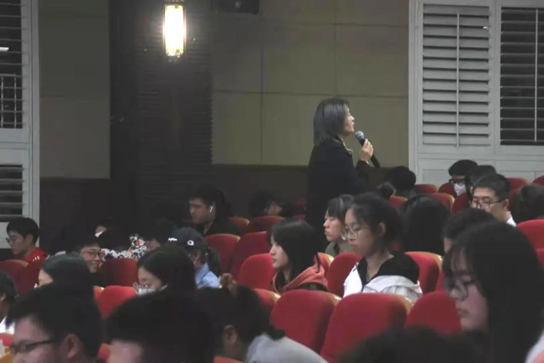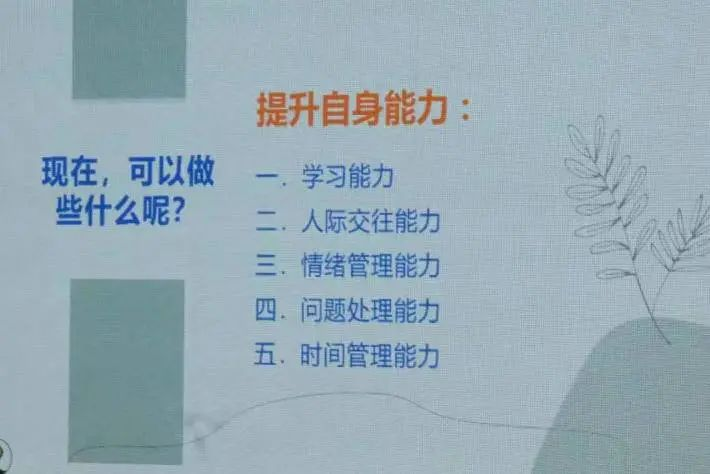 随后她与我们展开了一个小互动,伴随着舒缓的音乐和她耐心的引导,我们对五年后的自己展开想象。结束后她随机向同学们提问,大家对未来的自己都有着美好的憧憬,基于这些美好的憧憬,老师进而问道同学们接下去有什么行动计划,并说明这就要求我们要具备持续、广泛的学习能力,人际交往能力以及情绪管理能力。
