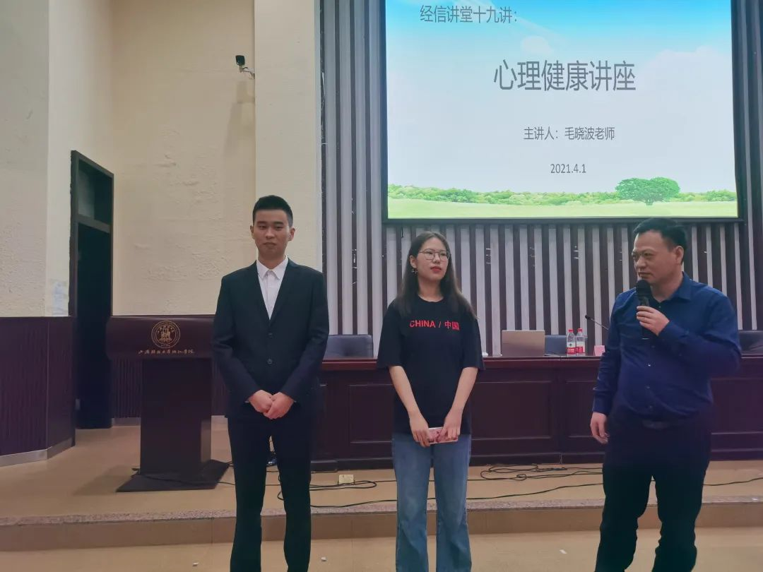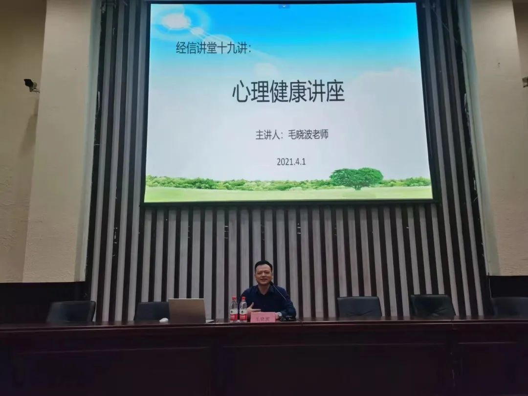 2021年4月1日晚18:30,我系邀请国家二级心理咨询师毛晓波老师做客经信讲堂第十九讲,于28-120报告厅作题为《心理健康》的讲座,讲座由系党总支副书记王明照老师主持,来自经信系各专业师生参加。