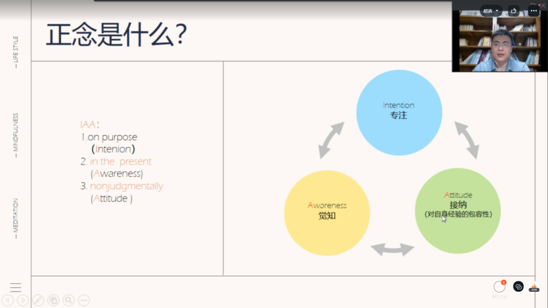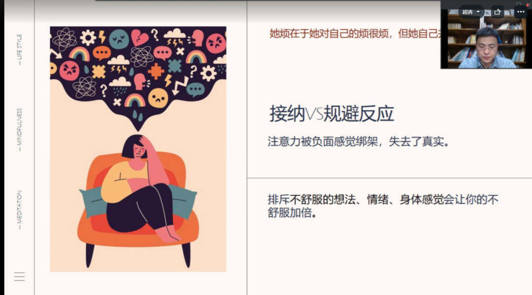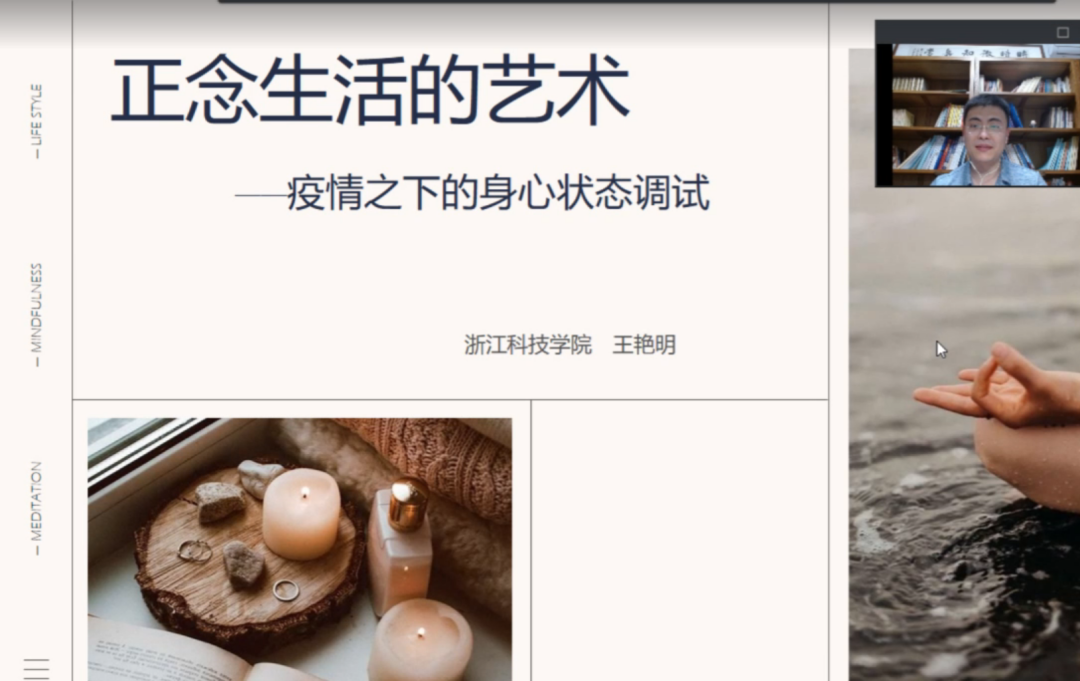 为使同学们在疫情压力下能有良好的身心健康状态,统计系于4月26日晚18:30开展了“吾心吾爱.飞扬青春”第三届正念心理健康节首场讲座。讲座主题为“正念生活的艺术—疫情之下的身心状态调试”,讲座由中国生命关怀协会静观专业委员会委员、般意资深正念冥想师王艳明老师主讲。